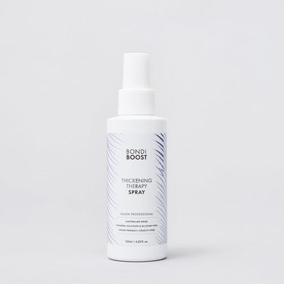Breathe life into fine, flat hair with the BondiBoost Thickening Spray. This lightweight styling spray contains a proprietary blend of powerful ingredients that work together to lift at the roots while expanding and plumping each strand, delivering instant thickness and volume. Known for its plumping powers, Hyaluronic Acid increases the density of each strand, while nutrient-rich vegan friendly collagen, ginseng and sea kelp strengthen and replenish stands, leaving your mane visibly thicker, fuller and healthier.