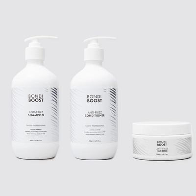 The Bondi Boost Anti Frizz Trio contains 1 x Bondi Boost Anti Frizz Shampoo 500ml , 1 x Bondi Boost Anti Frizz Conditioner 500ml and 1 x Bondi Boost Anti Frizz Mask 250ml.