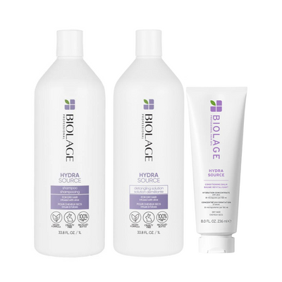 This bundle includes the Matrix best-selling Biolage Hydrasource Detangling Solution 1L, Biolage Hydrasource Shampoo 1L and Biolage Hydrasource Conditioning Balm 280ml.