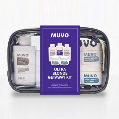 The Muvo Ultra Blonde Getaway Kit, for on-the-go maintenance, repair and styling collected in one little travel bag to maintain blonde, bleached, grey and highlighted hair.