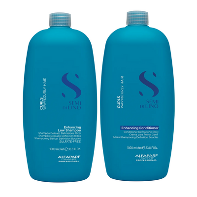 Alfaparf Milano Semi Di Lino Curls Enhancing Low Shampoo & Conditioner Duo offers two of Alfaparf's best-selling products and it is formulated with urban defense Pro to provide curls and coils with total protection and antipollution shield as well as a shine fix complex, color fix complex, and climate-proof to instantly boost hair shine, protect it from UV rays and colour fade out, and wraps each hair strand in humidity protection.