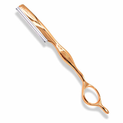 Enhance your cutting technique with the Focus Titanium Rose Gold Thinning Razor, designed for expert precision and comfort. Featuring a finger loop and ergonomically shaped rest, it ensures superior control during intricate work. Crafted from robust zinc alloy and coated in durable titanium, the R14 model delivers long-lasting performance while its elegant rose gold finish adds a sophisticated edge to your professional tools.