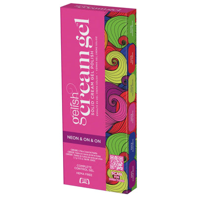The Gelish Cream Gel Solid Cream Gel Polish Palette Neon & On & On nail kit contain a unique solid LED gel with a smooth, buttery and workable texture that gives you complete control while working. Each Cream Gel nail kit palette has six colors in a lightweight, portable case that goes where you go with no spilling and no mess.