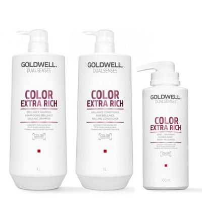 - Brilliance System: Goldwell Dualsenses Color Extra Rich Big Bottle Trio Bundle contains an innovative brilliance system with anti-oxidative pomegranate extract and a protective UV-filter to safeguard hair without weighing it down.