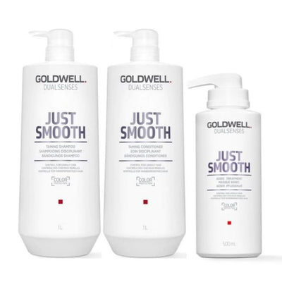 Discover a frizz-free, smooth mane with the Goldwell Dualsenses Just Smooth Big Bottle Trio Bundle. This carefully crafted set expertly manages unruly and frizzy hair, providing manageability and control while adding a gorgeous shine for irresistibly soft locks.