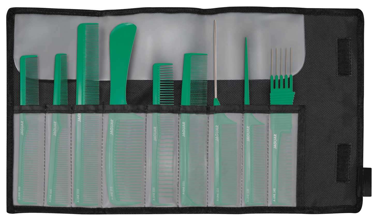 Featuring a variety of comb sizes and styles in a convenient roll up case, the Jaguar Ionic 9 Piece Comb Set is made from high quality plastic. These combs are heat resistant, anti-bacterial, anti-static and contain ions to assist hair in absorbing moisture.