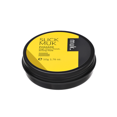Muk Slick Muk Pomade is a strong hold humidity resistant high gloss finish pomade that does not flake. Water soluble.