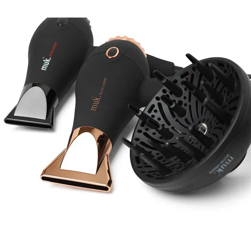 The Muk Blow 3900IR is the ultimate tool for drying and creating beautiful hair. This 3900-IR, 2300 Watt Professional blow dryer dries hair gently and quickly, while infusing it with shine, moisture balance and protection from thermal damage. This Muk hair dryer is so powerful that it can cut your drying time in half while still being gentle on your hair.