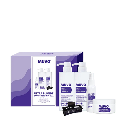 MUVO Ultra Blonde Bombshell in a Box is your complete blonde hair revival kit, loaded with everything you need to tone, repair, style, and shine like the show-stopping bombshell you are. Whether you’re going platinum, icy grey, silver, or golden blonde, this luxe collection has your back (and your roots).