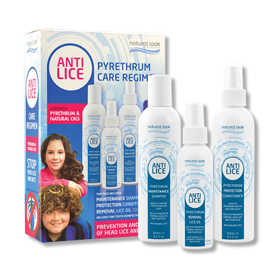 Natural Look Anti-Lice Pyrethrum Care Regimen Pack - Lice & Nit Pack for the prevention and control of head lice and nits. Contains Pyrethrum, Tea Tree Oil, Orange Oil, Castor Oil and Aloe Vera. Pack includes 250ml shampoo, 250ml leave-in conditioner spray and 100ml lice oil spray.