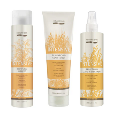 This Natural Look Intensive Trio cleanses and protects dry, straightened, permed or coloured hair, stressed or parched by the harmful effects of environmental pressures, thermal styling and chemical treatments. Quinoa Protein and Active Botanical Extracts will strengthen hair bonds and restore body and shine to the hair, providing lasting style support.