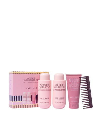 Indulge your hair—or gift someone special—with the NAK Hair Signature Holiday Nourish Trio Gift Pack, expertly crafted for dry, damaged, or colour-treated hair. This luxurious set uses vegan-friendly ingredients like Coconut Oil, Aloe Vera, Pear Extract, and Hydrolysed Rice Protein to cleanse gently, hydrate deeply, and protect against damage. Begin with the Nourish Shampoo (350ml) to lock in moisture and preserve colour vibrancy. Follow with the Nourish Conditioner (350ml) for enhanced softness, shine, and manageability. Complete the regimen with the Replends Moisture Mask (150ml), a lightweight leave-in that safeguards against heat, UV, and environmental stressors. A complimentary NAK Professional Comb is included for effortless detangling and product distribution.
