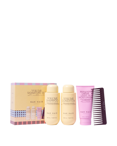 Designed for fine, limp, or flat hair, this lightweight set provides lasting volume without adding weight. Ideal for special occasions or daily use, the trio delivers professional-level fullness with a soft, manageable finish. Begin with NAK Volume Shampoo (350ml) to cleanse gently while boosting natural body and bounce. Next, use NAK Volume Conditioner (350ml) to strengthen and enhance hair’s fullness and movement with a feather-light touch. Finish with NAK Replends Crème Leave-in Moisturiser (150ml), a nourishing treatment that hydrates, smooths, and shields hair from heat and environmental damage—without compromising volume. Perfect for gifting or personal indulgence, this set lifts your hair care routine for the holidays.