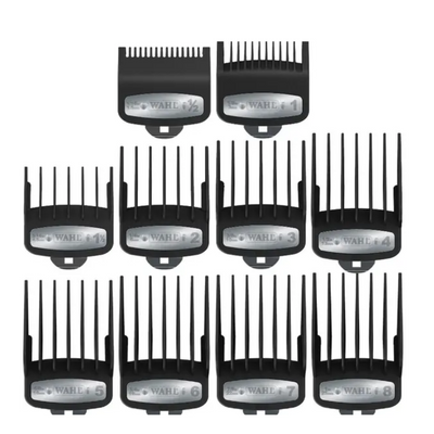 The Wahl Premium Guide Combs 10-Pack gives professionals the full range of cutting lengths—from #0.5 (1.5mm) to #8 (25mm)—in one high-performance set. Designed for durability and control, each guide comb is crafted from engineering-grade material, making them 70% stronger than standard Wahl combs.