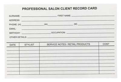 Keep track of your salon's service delivery with our Salon Record Cards. The professionally designed cards are easy to fill in and will help you keep your staff and client records organized and up to date.